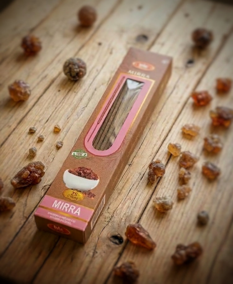 Si buscas algo más profundo y espiritual, la mirra es tu aliada. Es una resina sagrada con un aroma terroso y místico que se ha usado durante siglos para limpiar los espacios de forma profunda y preparar la mente para la meditación.