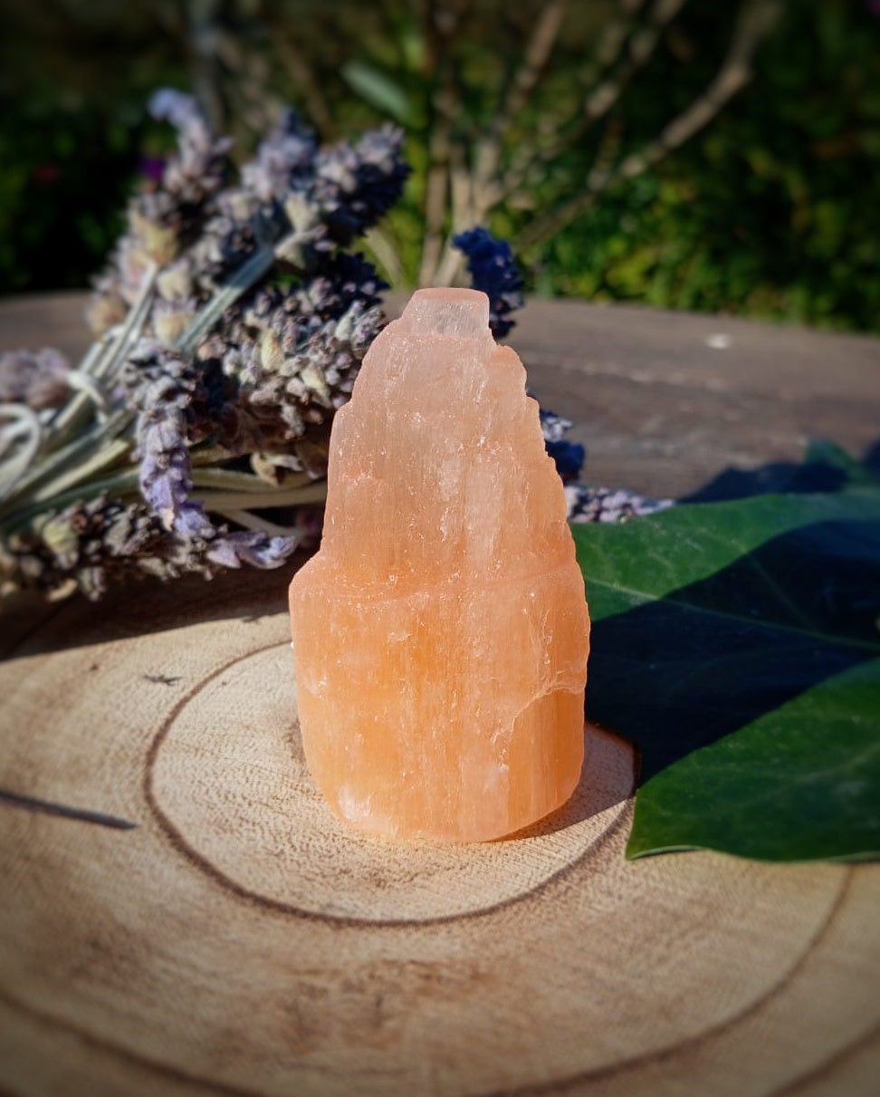 La Selenita Naranja es la hermana cálida de la blanca. Su color anaranjado le otorga una vibración mucho más terrenal y acogedora. Es como tener un pequeño rayo de sol capturado en piedra sobre tu escritorio o en el salón.